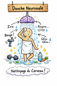Ce nettoyage naturel porte un nom : le système glymphatique. Découvert il y a une dizaine d’années, il agit comme un réseau d’éboueurs invisibles qui élimine les déchets et toxines grâce à la circulation du liquide céphalorachidien le long des vaisseaux sanguins surtout pendant le sommeil. Il entoure et protège le cerveau et la moelle épinière. Pendant que je dors profondément, le liquide céphalo-rachidien circule entre mes neurones, emporte les déchets du jour (y compris ceux liés au vieillissement cérébral) et les élimine.